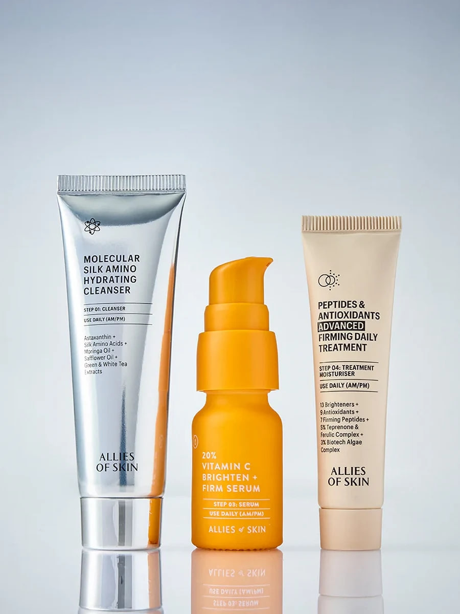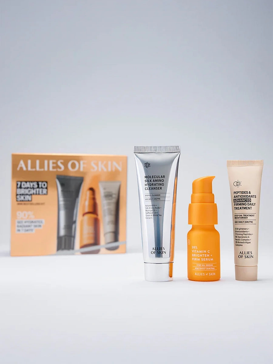 Это набор для сияния кожи лица за 7 дней, содержащий мини-версии трех продуктов с активными компонентами. Он помогает осветить тон, придать коже сияние, увлажнить и поддержать упругость, работая как повседневная яркая рутина каждый день в течение недели. Формулы содержат мощные антиоксиданты (витамин C, глутатион), аминокислоты шелка и пептиды, что делает кожу более ровной, гладкой и сияющей.