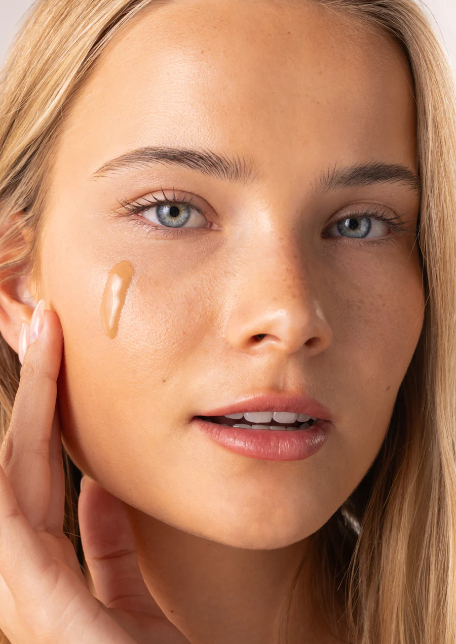 Нанесите на кончики пальцев, кисточку для макияжа или косметический спонж и обильно нанесите на лицо и шею.