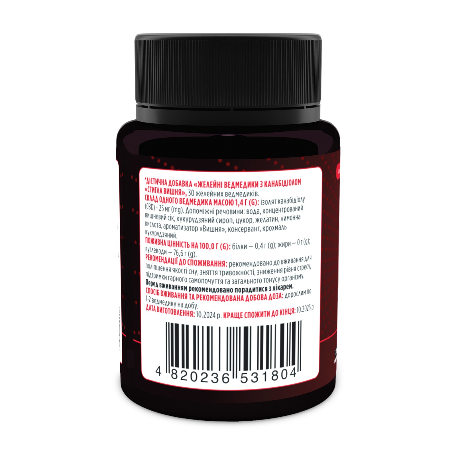 Дополнительные ингредиенты: Вода, концентрированный вишневый сок, кукурузный сироп, сахар, желатин, лимонная кислота, ароматизатор "Вишня", консервант, крахмал кукурузный.