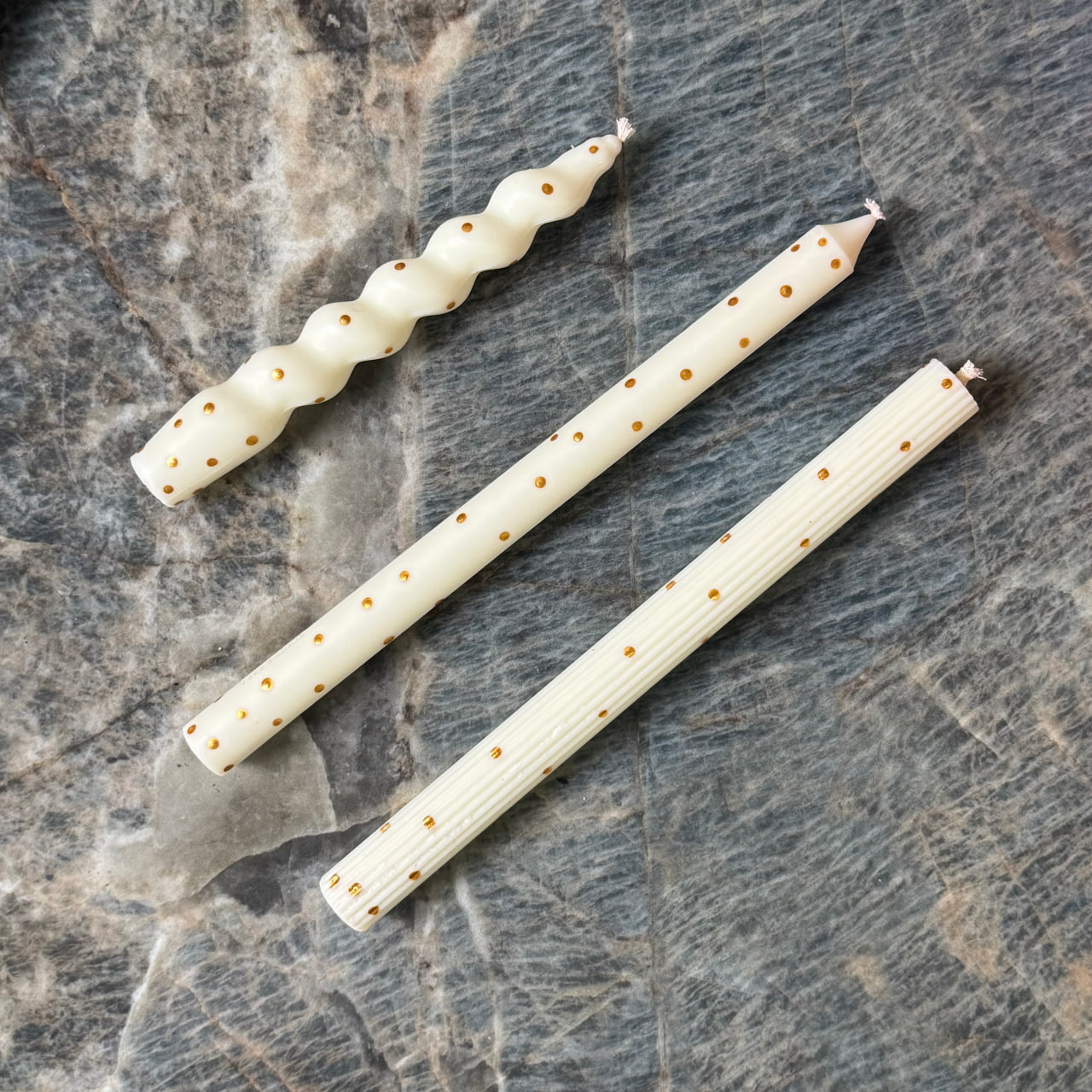 FIRE RABBIT Gold Dot Taper Candles, Full Set of 3 (in various colours)