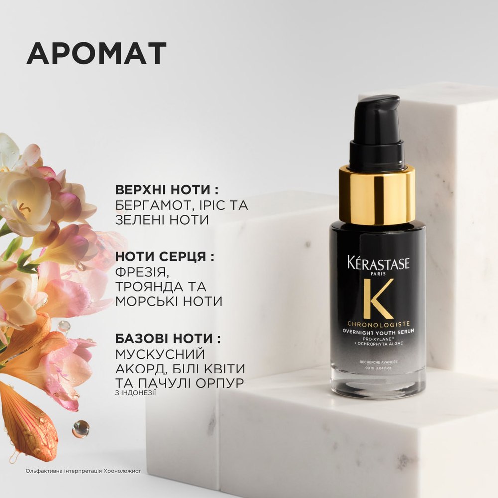 Сыворотка Kérastase Chronologiste Serum Overnight Youth Serum обеспечивает интенсивный ночной уход, направленный на решение таких проблем, как сухость, тусклость, рыхление, отсутствие объема и уменьшение густоты волос. Пока вы спите, восстановительная формула средства работает, чтобы избавиться от видимых признаков старения, помогая волосам восстановить свою природную жизненную силу и прочность. Утром волосы становятся более объемными, гладкими, здоровыми и красиво восстановленными, мягкими на ощупь и с обновленным блеском. Наполненная нежным ароматом, она превращает ваш ночной уход в успокаивающий, чувственный ритуал, обеспечивая при этом невероятные результаты.