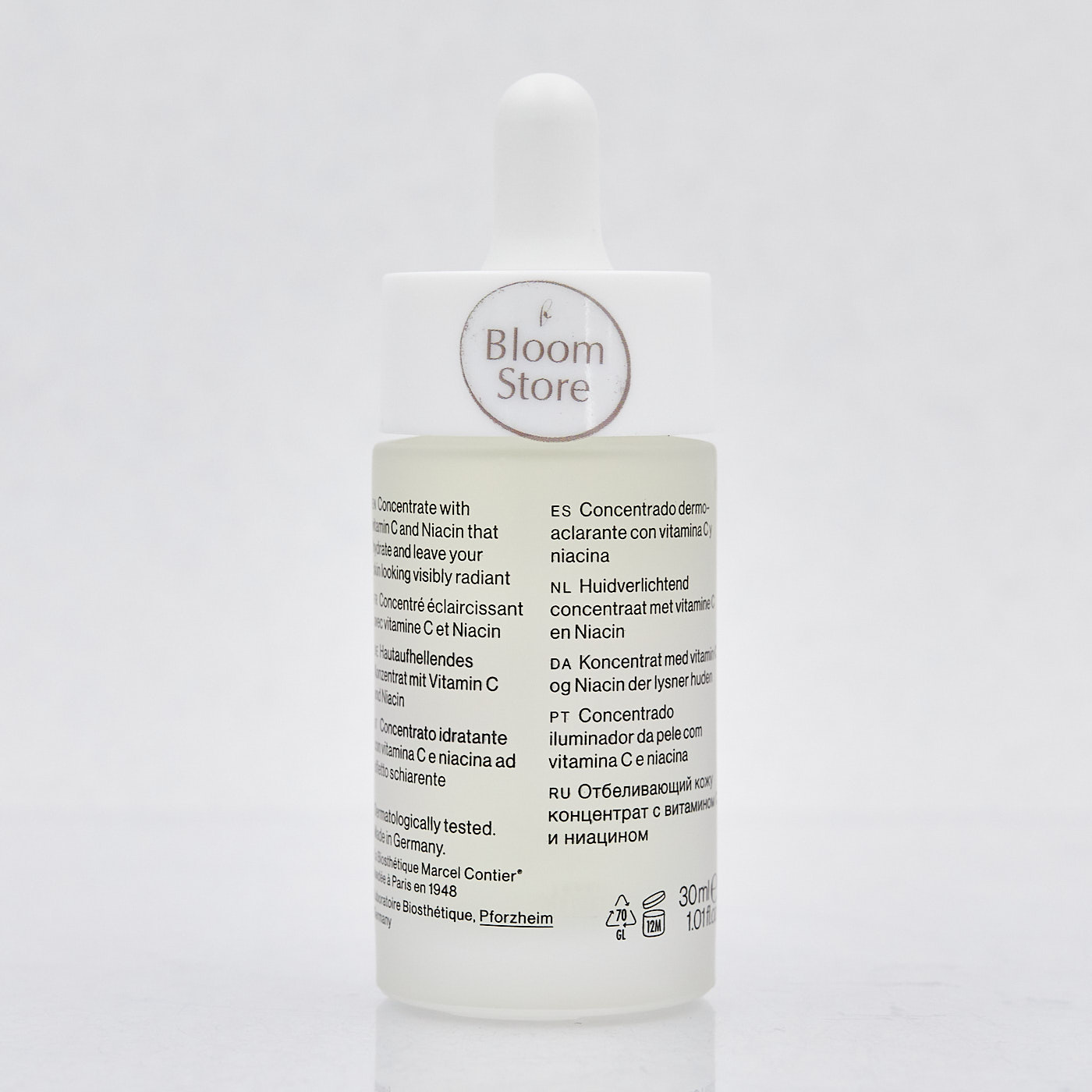 Многие исследования показывают, что молодой внешний вид кожи зависит не столько от отсутствия морщин, сколько от ровного цвета лица. Видимые нарушения пигментации заставляют любую кожу выглядеть старше. Виной тому – повышенная выработка кожного пигмента меланина. Мощное сочетание витаминов С и ниацина в Illuminating Concentrate обеспечивает эффективное улучшение состояния кожи. Поддерживаемые специально осветляющей кожу гиалуроновой кислотой они выравнивают неровности цвета. Снижается синтез меланина и чрезмерная пигментация. Стабилизированный витамин С осветляет кожу, нейтрализует окислительные повреждения, например вызванные UV-излучением, и защищает от новых повреждений. Наносите ли вы его самостоятельно или смешиваете с обычным кремом по уходу La Biosth etique, всего несколько капель концентрированной формулы хватает для заметно более упругой кожи и ровного сияющего цвета лица.