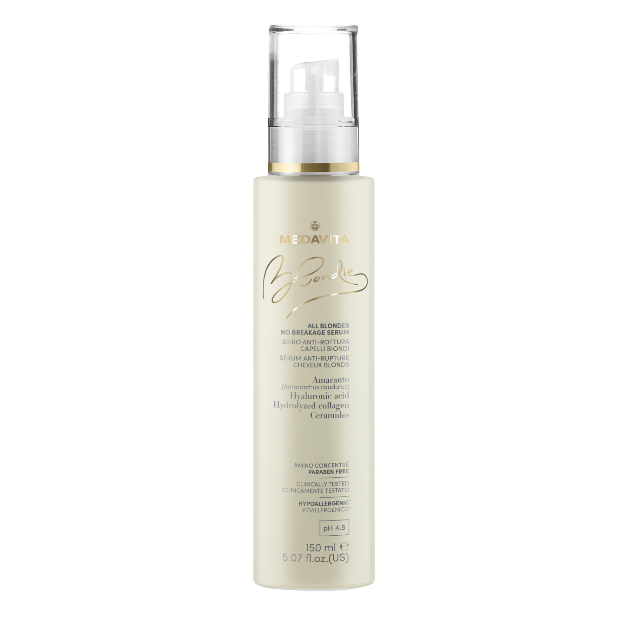 Укрепляющая сыворотка против ломкости для всех типов белокурых волос (pH 4,5) — делает волосы гладкими и облегчает расчесывание, снижает риск ломкости волос, делая структуру более крепкой, заполняет поврежденные участки структуры волос. Питает, увлажняет и защищает волосы от UVA/UVB солнечных лучей и окисления.
