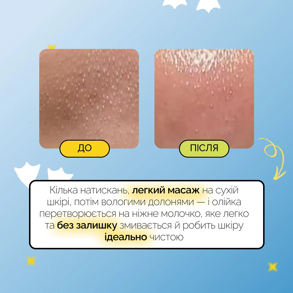 Нанесите небольшое количество масла (2-3 нажатия) на сухую кожу лица, распределите средство массирующими движениями, уделяя особое внимание зонам с расширенными порами, черными крапинками и стойким макияжем. Смочите руки водой и продолжайте массировать, пока масло не превратится в молочко. Тщательно смойте теплой водой и завершите умывание средством на водной основе (гель или пенка).