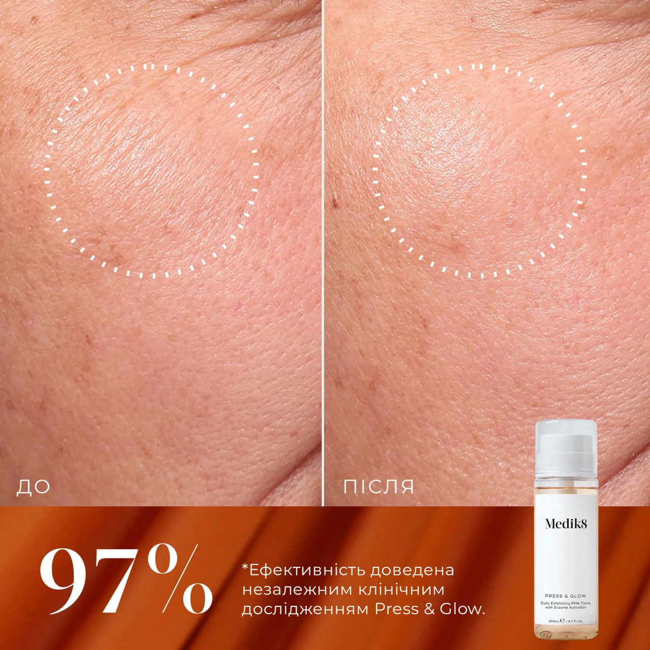 Клинически доказано, что тоник Press & Glow с полигидроксикислотой (PHA) в составе заметно усиливает сияние кожи и выравнивает текстуру кожи уже через 2 недели*. Он создан как мягкая и комфортная альтернатива традиционным кислотным тоникам, часто пересушивающим и вызывающим ощущение стянутости кожи.