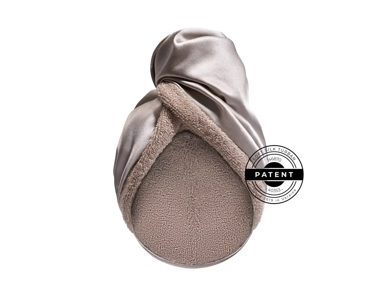 Двухстороннее полотенце-тюрбан из натурального 100% шелка и махры для бережного ухода за мокрыми волосами. Полотенце-тюрбан имеет универсальный размер и оснащен пуговицей и петелькой для комфортного использования.