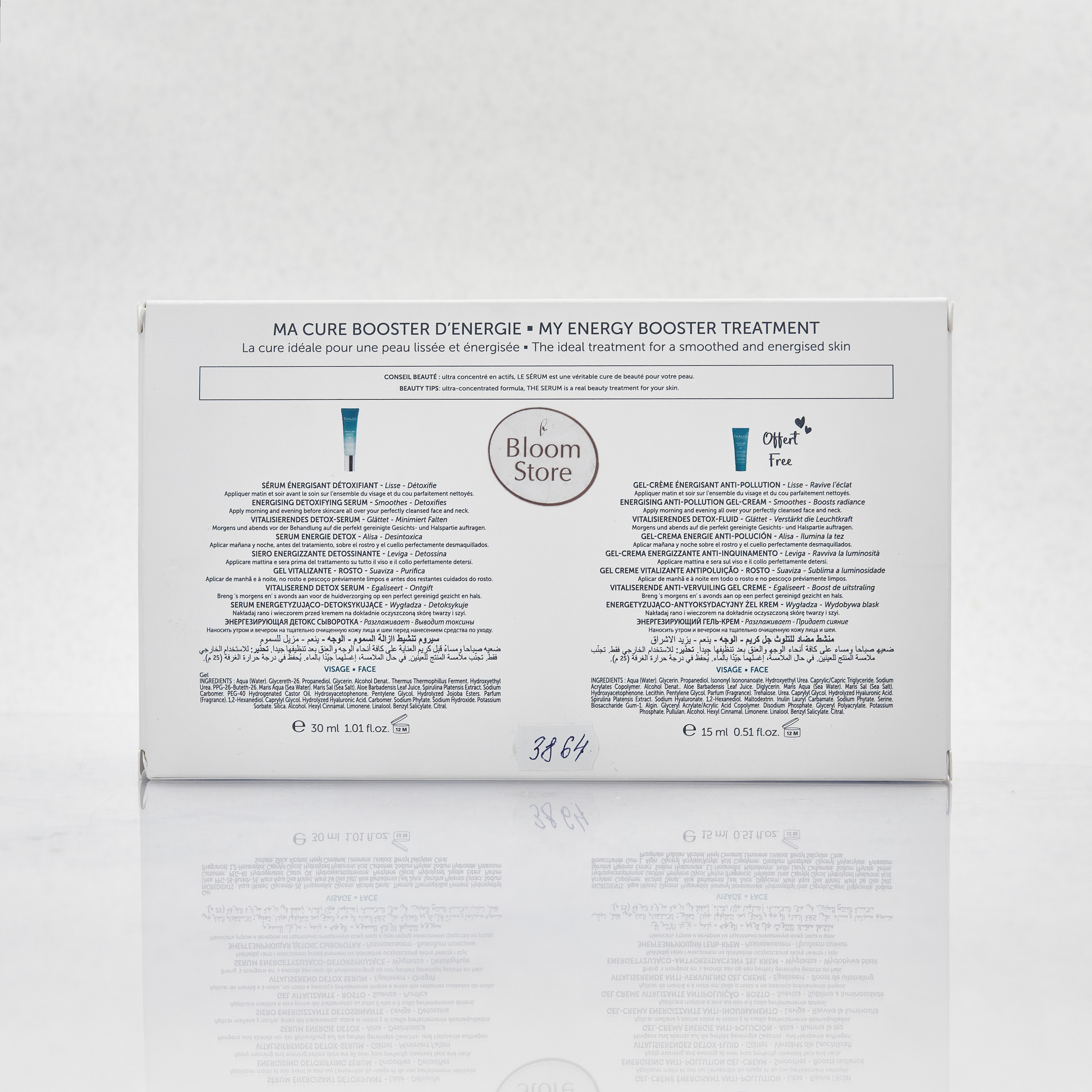 Energy Detoxifying Serum Spiruline Boost: Water, glyceret-26, propanediol, glycerin, denatured alcohol, thermos thermophilic enzyme, hydroxyethyl urea, PPG-26-butet-26, sea water, sea salt, aloe barbadensis leaf juice, sodium carbox, PEG-40 hydrogenated castor oil, hydroxyacetophenone , pentylene glycol, hydrolyzed jojoba ethers, fragrance, 1,2-hexanediol, caprylic glycol, hydrolyzed hyaluronic acid, carbomer, sodium phytate, sodium hexyl, monene hydroxide, linalool, benzyl salicylate, citral.