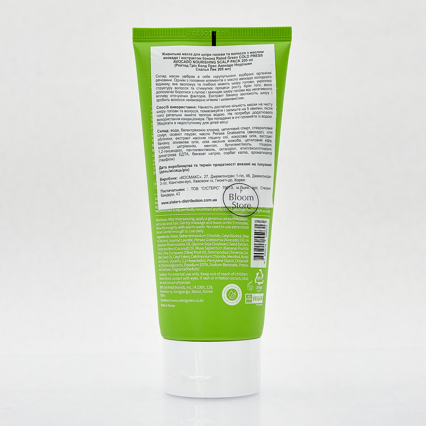 Питательная маска с маслом авокадо Rated Green Cold Press Avocado Nourishing Scalp Pack – содержит органическое масло авокадо холодного отжима, тщательно подобранные натуральные компоненты и экстракт банана, который эффективно укрепляет и питает кожу головы и волосы. Обогащенная натуральным маслом авокадо холодного отжима и экстрактом банана, маска глубоко питает и увлажняет истощенную и сухую кожу головы, насыщая ее полезными элементами. Придает волосам здоровую мягкость по всей длине, оставляя нежный аромат банана. Продукт достаточно мягкий и подходит для ежедневного использования, полностью заменяя собой кондиционер. Благодаря содержанию масла авокадо, средство защищает волосы от вредного воздействия окружающей среды, перепадов температуры и солнечных лучей.