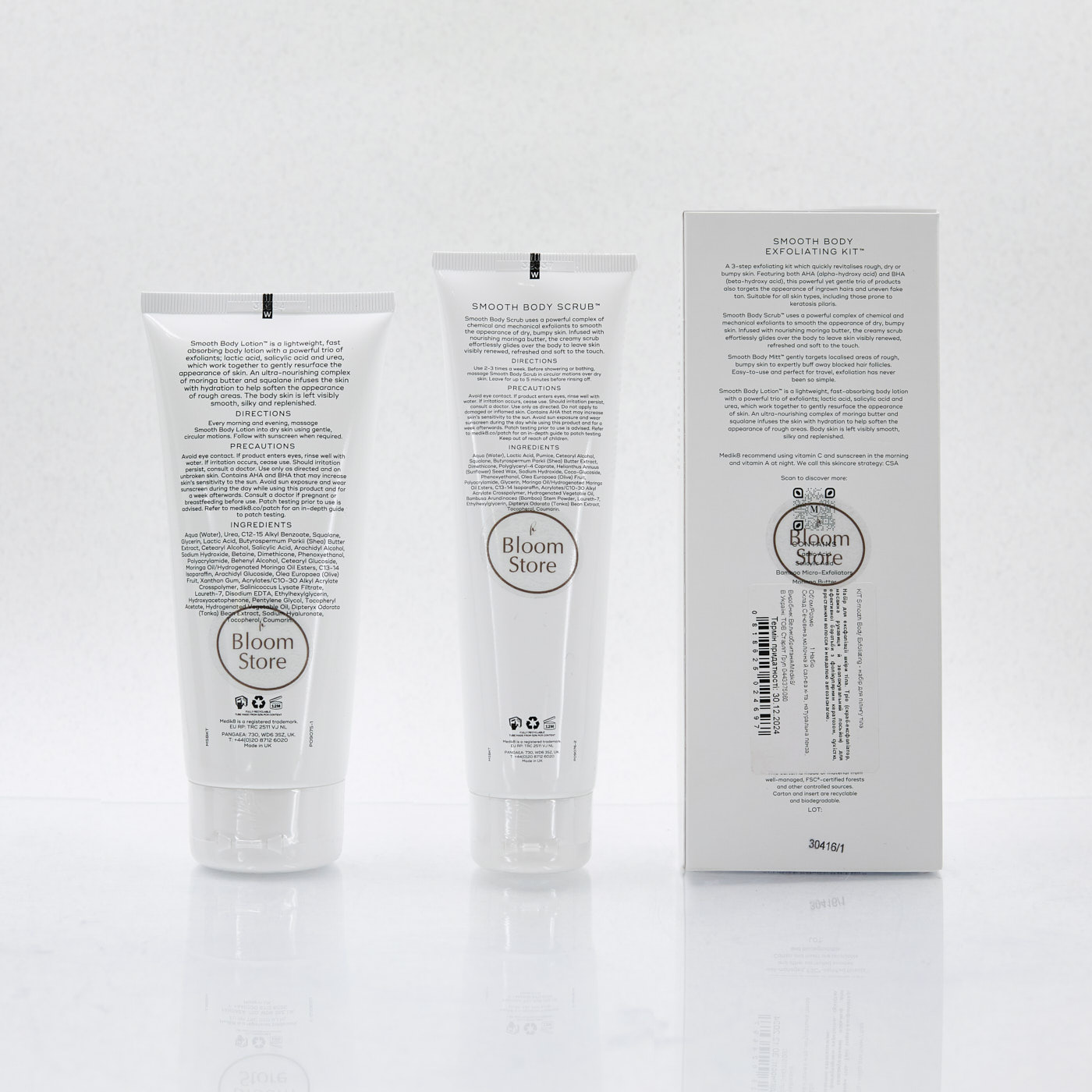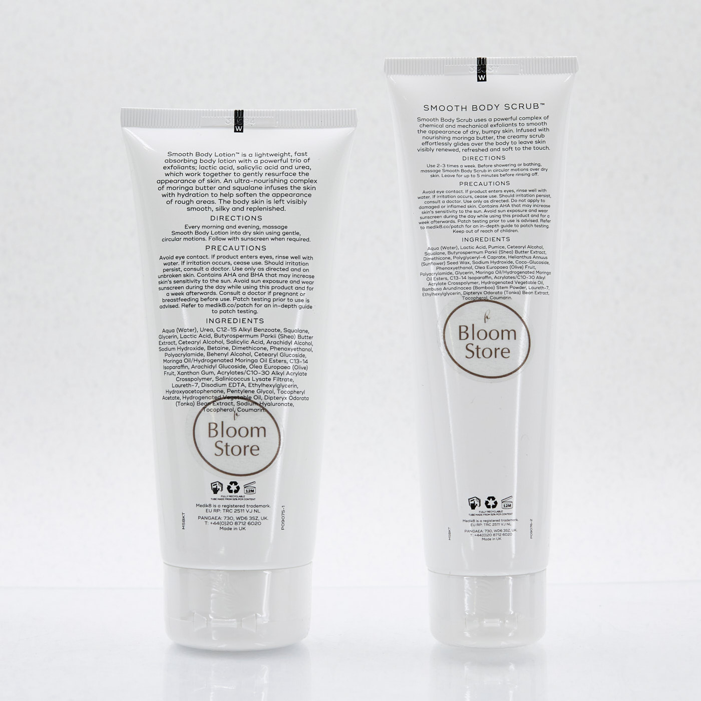 Smooth Body Lotion: Aqua (Water), C12-15 Alkyl Benzoate, Urea, Squalane, Glycerin, Cetearyl Alcohol, Lactic Acid, Butyrospermum Parkii Butter Extract, Salicylic Acid, Arachidyl Alcohol, Sodium Hydroxide, Betaine, Moringa Oil/Hydrogenated Moringa Oil Esters, Dimethicone, Olea Europaea Fruit, Sodium Hyaluronate, Salinicoccus Lysate Filtrate, Behenyl Alcohol, Tocopherol, Glucose, Hydrogenated Vegetable Oil, Arachidyl Glucoside, Tocopheryl Acetate, Dipteryx Odorata (Tonka) Bean Extract, Acrylates/C10-30 Alkyl Acrylate Crosspolymer, Cetearyl Glucoside, Pentylene Glycol, Xanthan Gum, Hydroxyacetophenone, Disodium EDTA, Polyacrylamide, Phenoxyethanol, C13-14 Isoparaffin, Laureth-7, Ethylhexylglycerin, Coumarin.