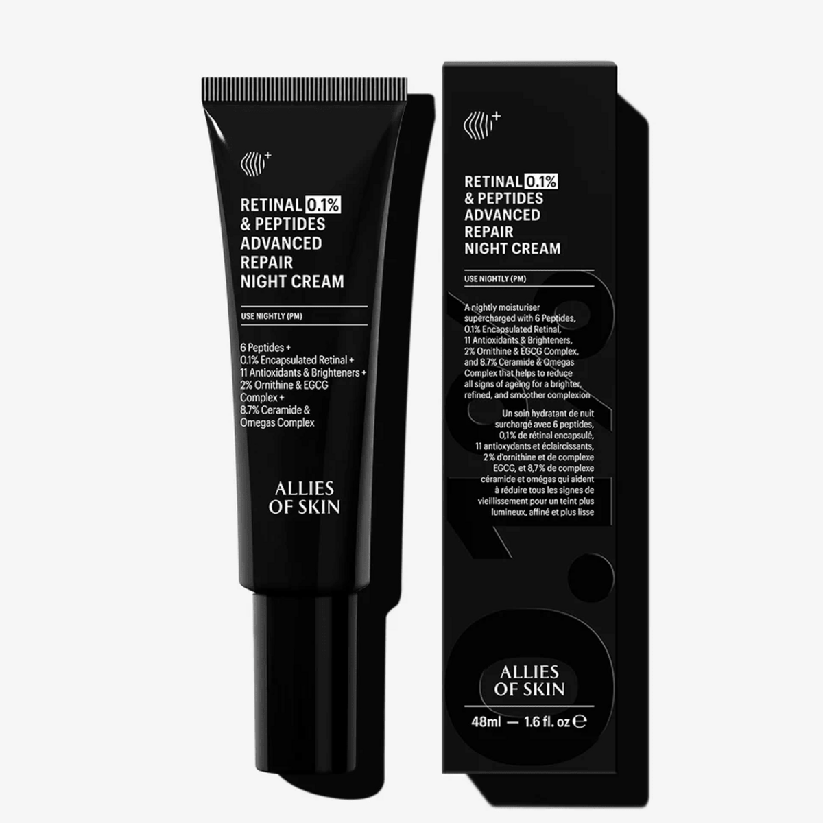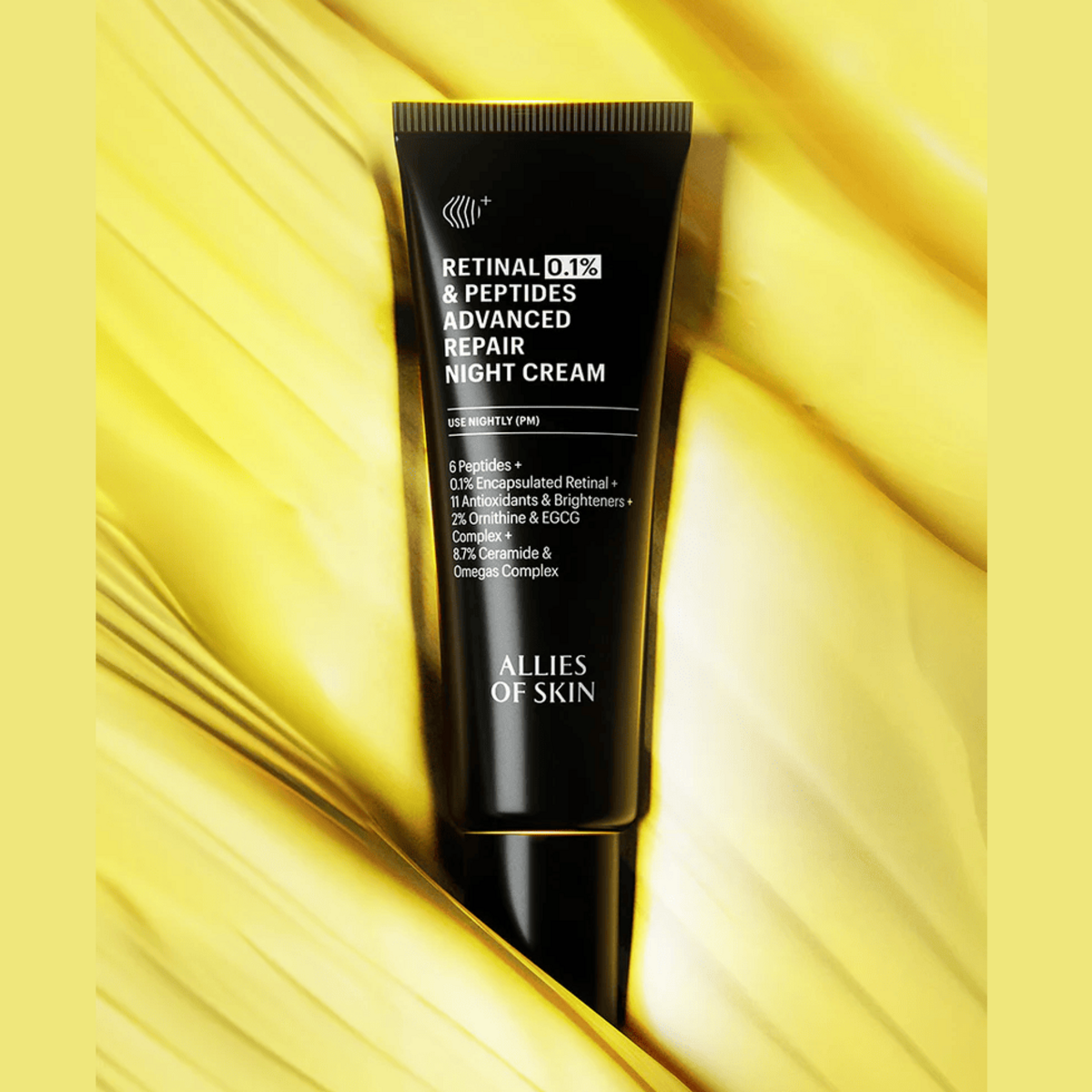 Нічний крем з ретиналем і пептидами для відновлення від Allies of Skin дозволяє ефективно працювати з усім комплексом ознак фотостаріння завдяки підвищеній концентрації ретиналю – компонента, який, згідно з дослідженнями, діє в 11 разів швидше за ретинол, має більш високу біодоступність і при цьому делікатніше впливає на шкіру, не спричиняючи подразнень.