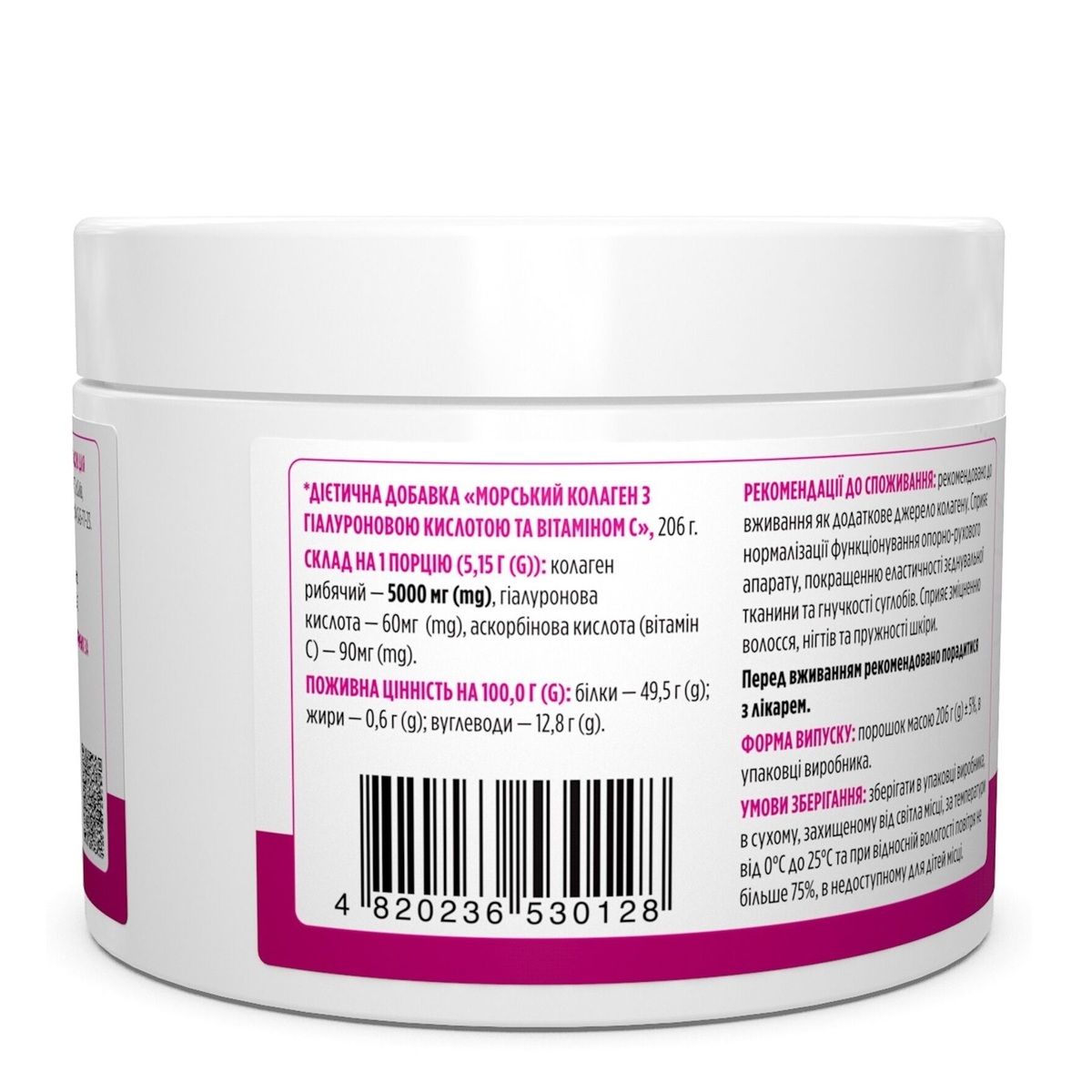 В одній порції: Колаген 5000 мг, Вітамін С 90 мг, Гіалуронова кислота 60 мг.