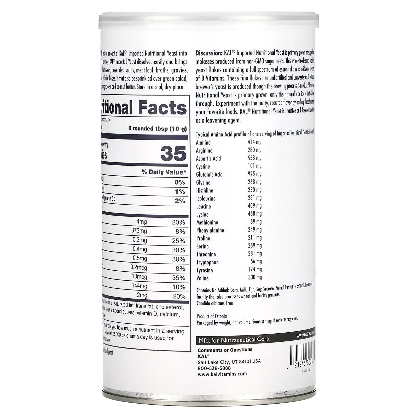 Типовий амінокислотний профіль однієї порції імпортних харчових дріжджів включає: Аланін 414 мг, Аргінін 280 мг, Аспарагінова кислота 558 мг, Цистин 101 мг, Глютамінова кислота 925 мг, Гліцин 268 мг, Гістидин 250 мг, Ізолейцин 281 мг, Лейцин 409 мг, Лізин 468 мг, Метіонін 69 мг, Фенілаланін 249 мг, Пролін 211 мг, Серин 269 мг, Треонін 281 мг, Триптофан 56 мг, Тирозин 174 мг, Валін 330 мг.