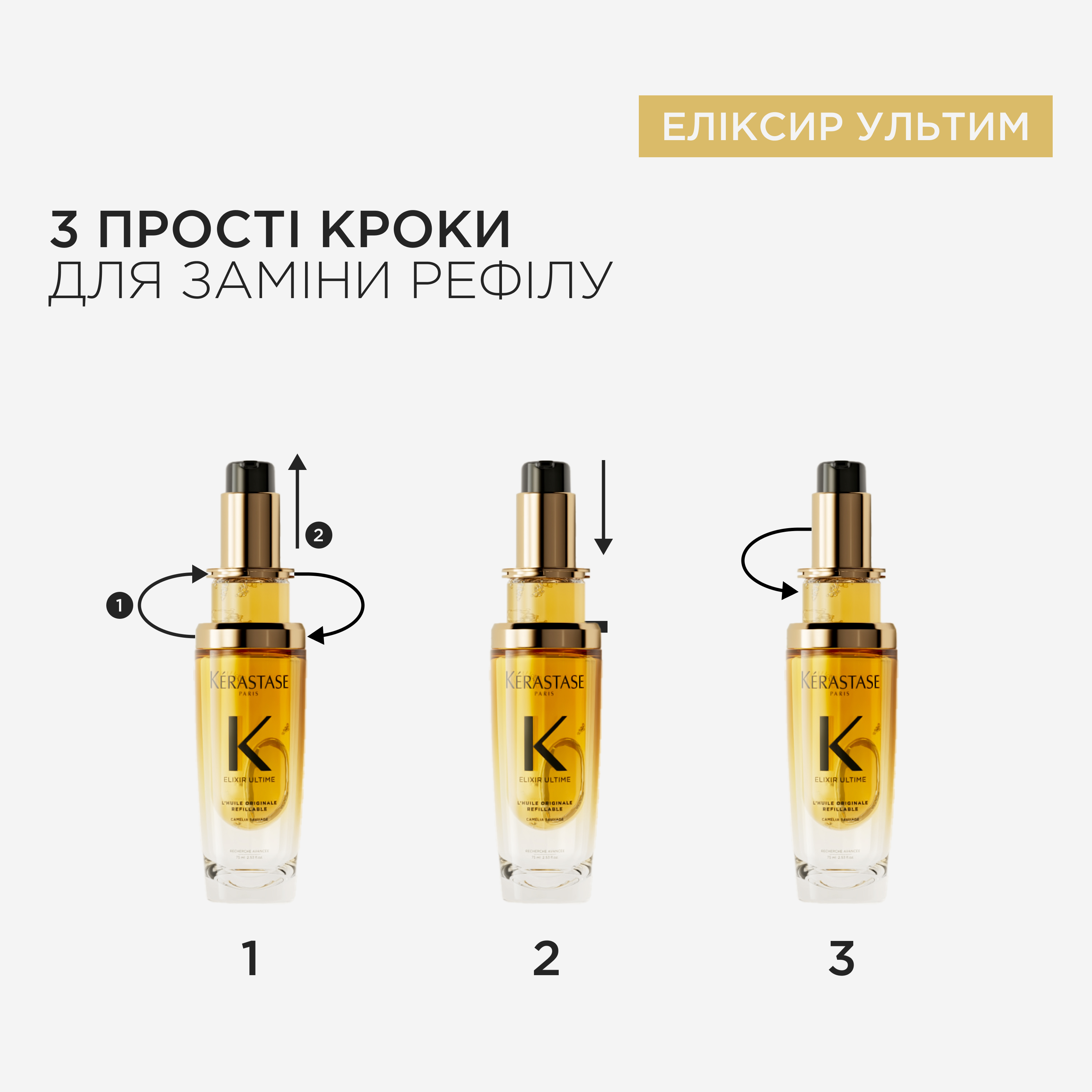 Нанесіть 1-2 краплі олії Elixir Ultime L’huile Originale на мокре або сухе волосся як незмивний засіб.