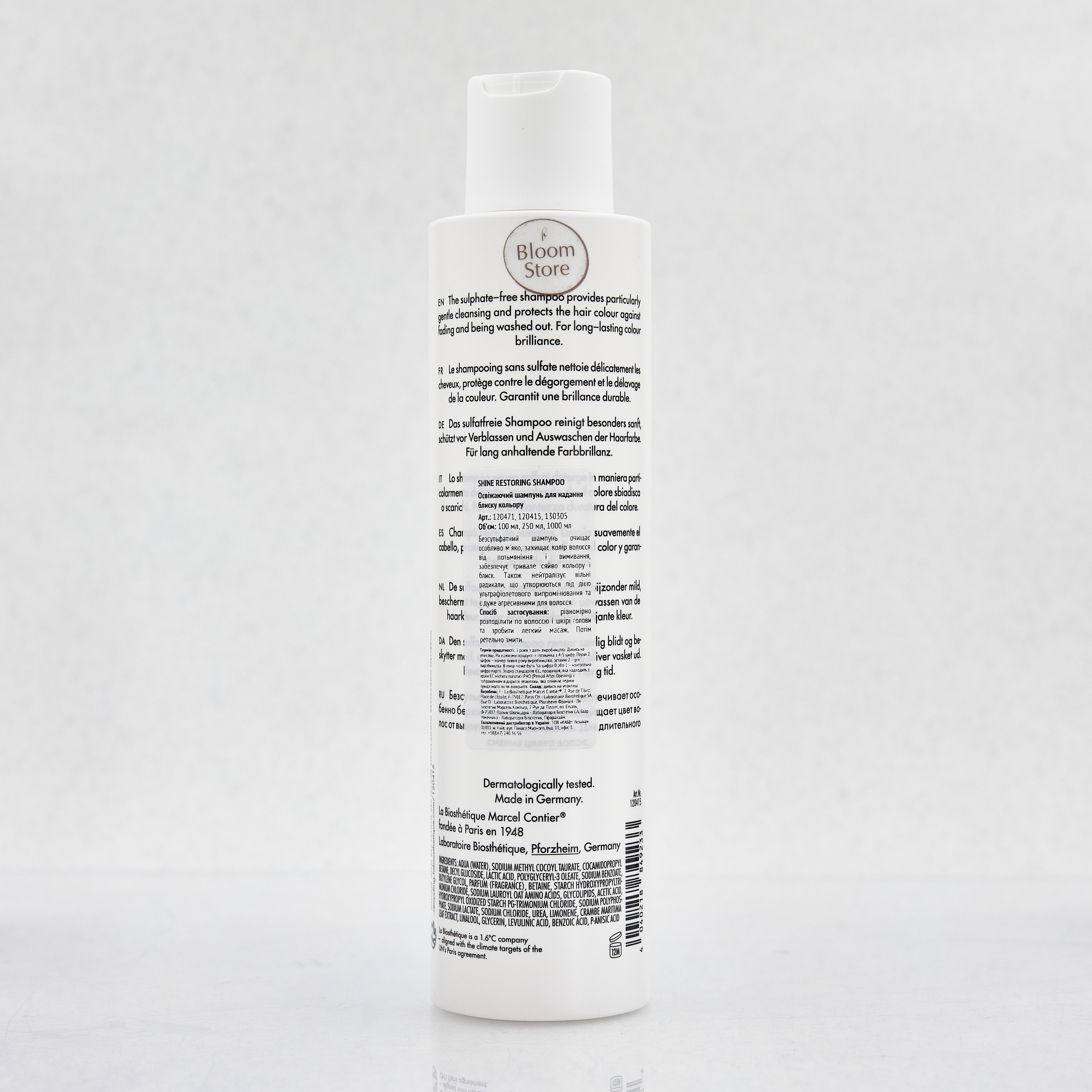 Захист кольору волосся розпочинається з миття. Треба звільнити волосся від шкірного сала і забруднень, але без одночасного вимивання косметичних пігментів, накопичених під час фарбування. Цього можна досягти тільки в тому випадку, якщо кутикула залишається закритою і не стає огрубілою від надмірної дії поверхневоактивних речовин. Завдяки безсульфатній, особливо щадній формулі шампунь Shine Restoring Shampoo забезпечує баланс між очищенням і захистом кольору.