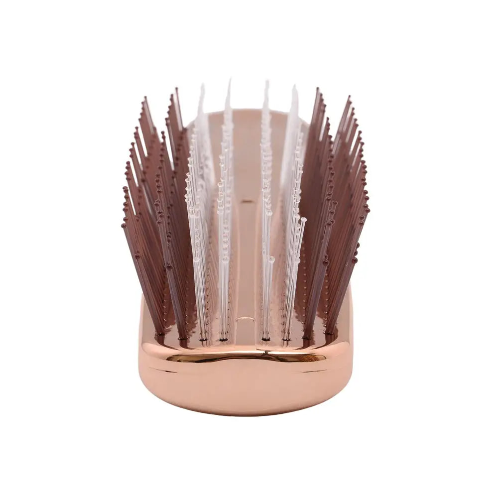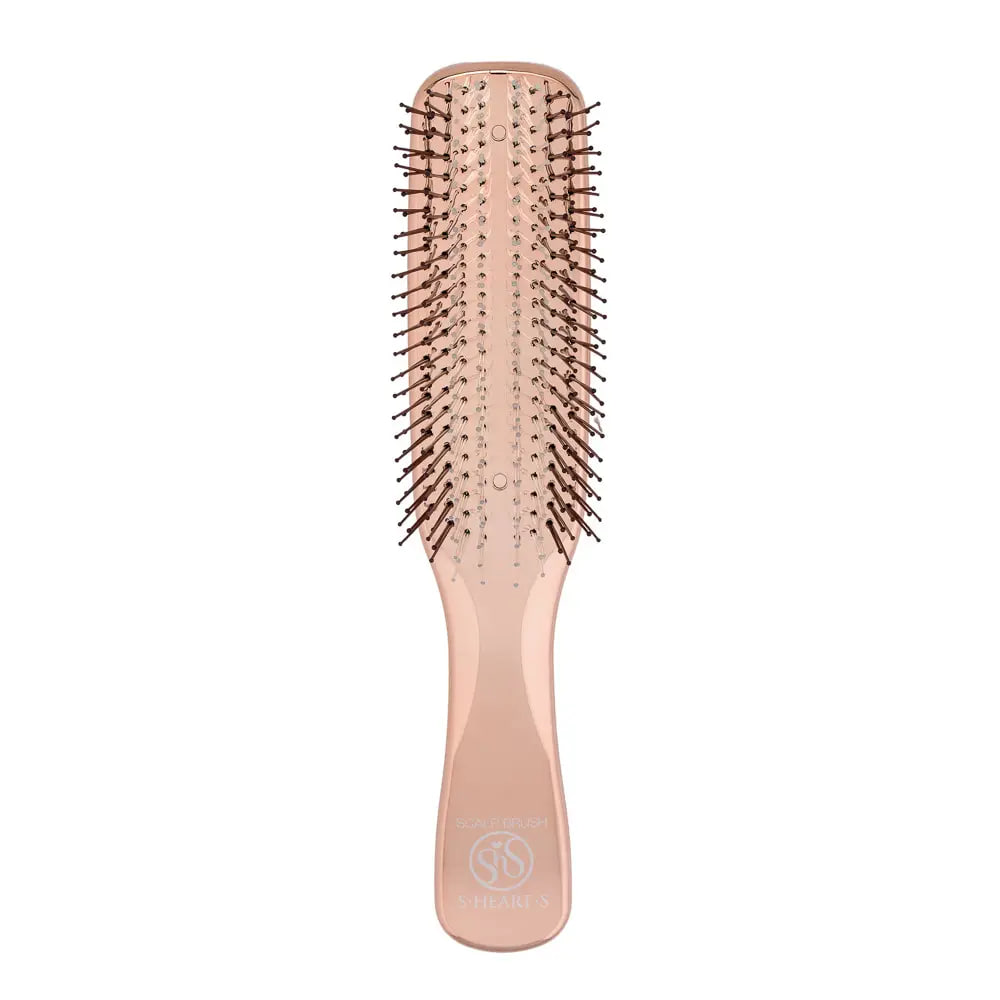 Розчіска для волосся рожеве золото S-Heart-S Scalp Brush World Model Long Pink Gold - спеціально розроблена розчіска для догляду за волоссям і шкірою голови. Гладкі та рівномірно розташовані зубці допомагають розчісувати волосся без травмування, зменшує ламкість волосся і запобігає його заплутуванню. 572 щетинки забезпечують м’яку ексфоліацію та очищення пор шкіри голови від себуму, поту та залишків стайлінгових засобів.