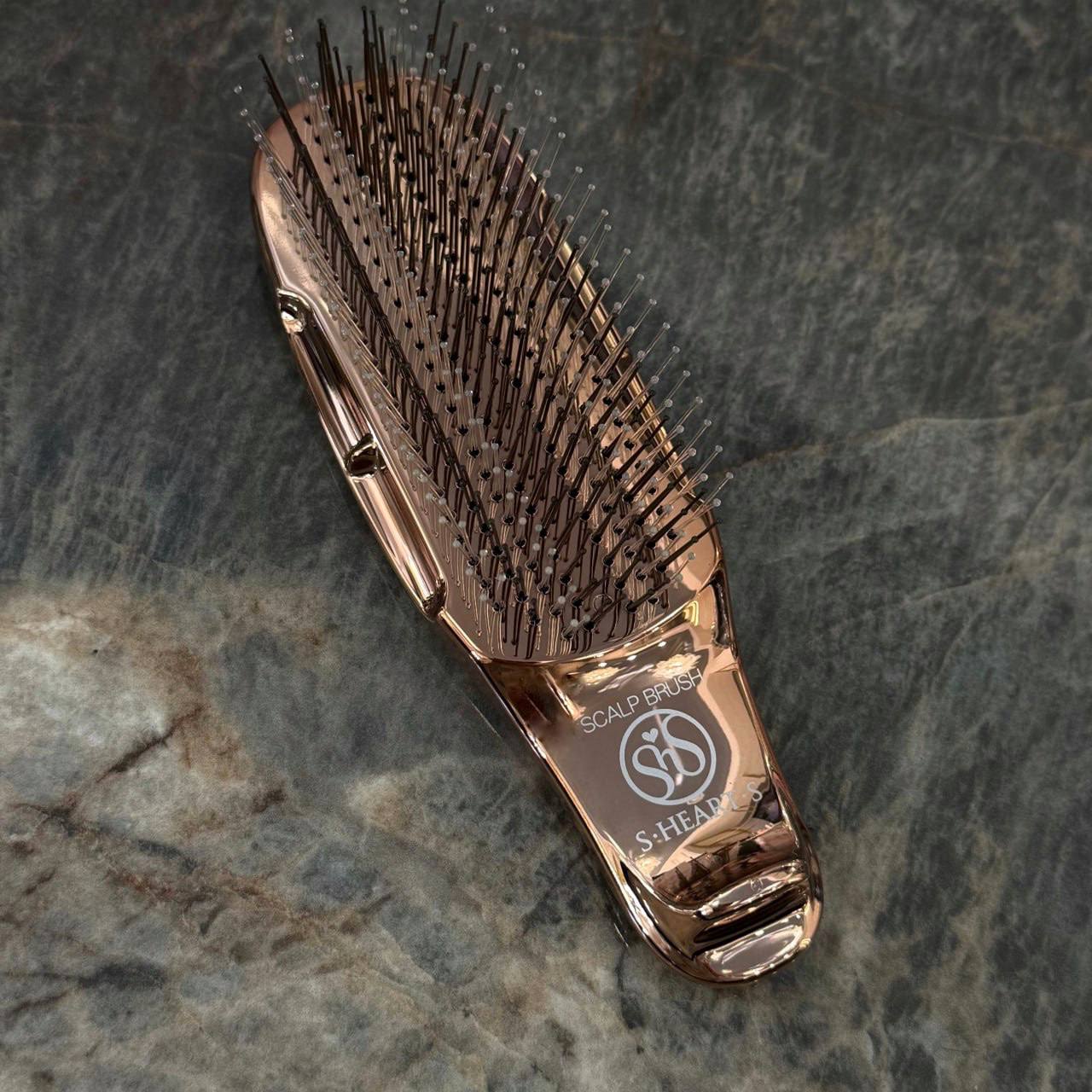 Розчіска для волосся рожеве золото S-Heart-S Scalp Brush World Model Long Pink Gold - спеціально розроблена розчіска для догляду за волоссям і шкірою голови. Гладкі та рівномірно розташовані зубці допомагають розчісувати волосся без травмування, зменшує ламкість волосся і запобігає його заплутуванню. 572 щетинки забезпечують м’яку ексфоліацію та очищення пор шкіри голови від себуму, поту та залишків стайлінгових засобів.