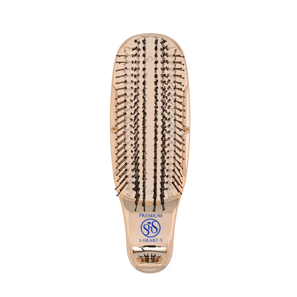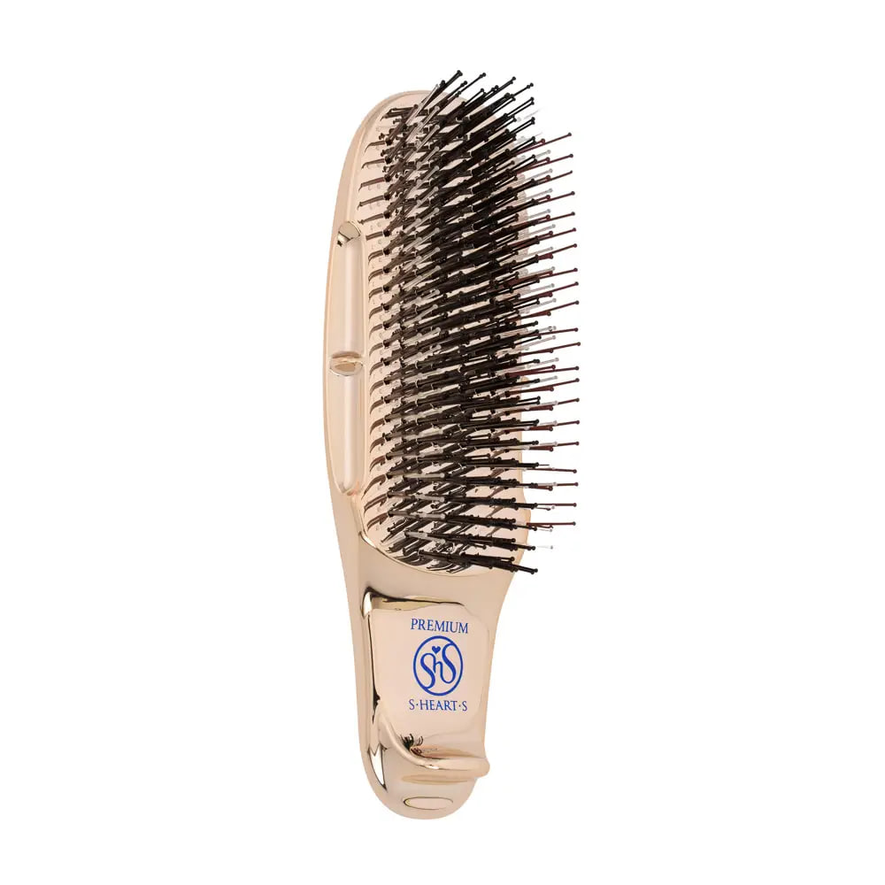 Розчіска для волосся золотиста S-Heart-S Scalp Brush World Premium Short Champagne Gold - спеціально розроблена розчіска із короткою ручкою для догляду за волоссям і шкірою голови. Гладкі та рівномірно розташовані зубці допомагають розчісувати волосся без травмування, зменшує ламкість волосся і запобігає його заплутуванню. 572 щетинки забезпечують м’яку ексфоліацію та очищення пор шкіри голови від себуму, поту та залишків стайлінгових засобів.