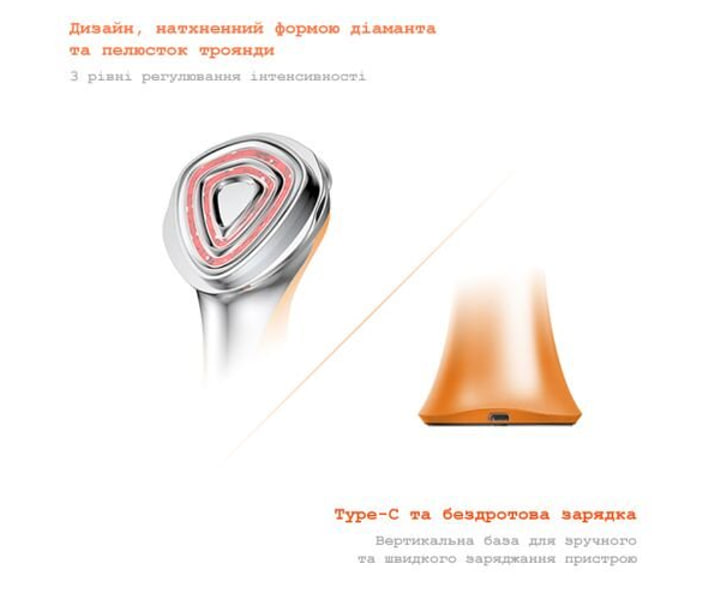 Яскравий помаранчевий корпус, ергономічна форма та сенсорне керування роблять використання комфортним. Передбачено 3 рівні інтенсивності, зарядка через Type-C або бездротову базу.